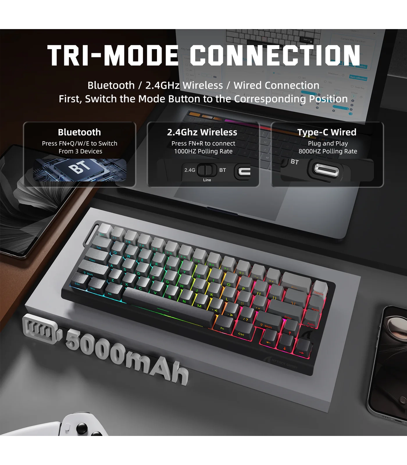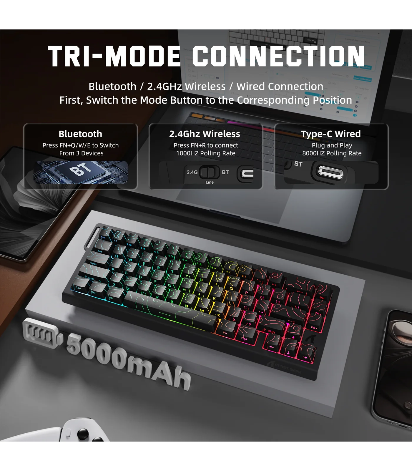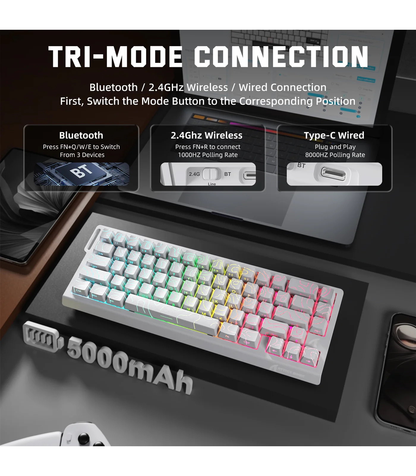 تعتمد لوحة المفاتيح على تصميم مدمج بنسبة 65% بعدد 66 مفتاحًا، لتوفير مساحة إضافية على المكتب مع الحفاظ على المفاتيح الأساسية وسهولة الاستخدام. كما تدعم ثلاثة أوضاع اتصال تشمل USB-C السلكي و2.4GHz اللاسلكي وBluetooth، مع بطارية مدمجة بسعة 5000mAh تضمن استخدامًا لاسلكيًا طويل الأمد دون الحاجة للشحن المتكرر.