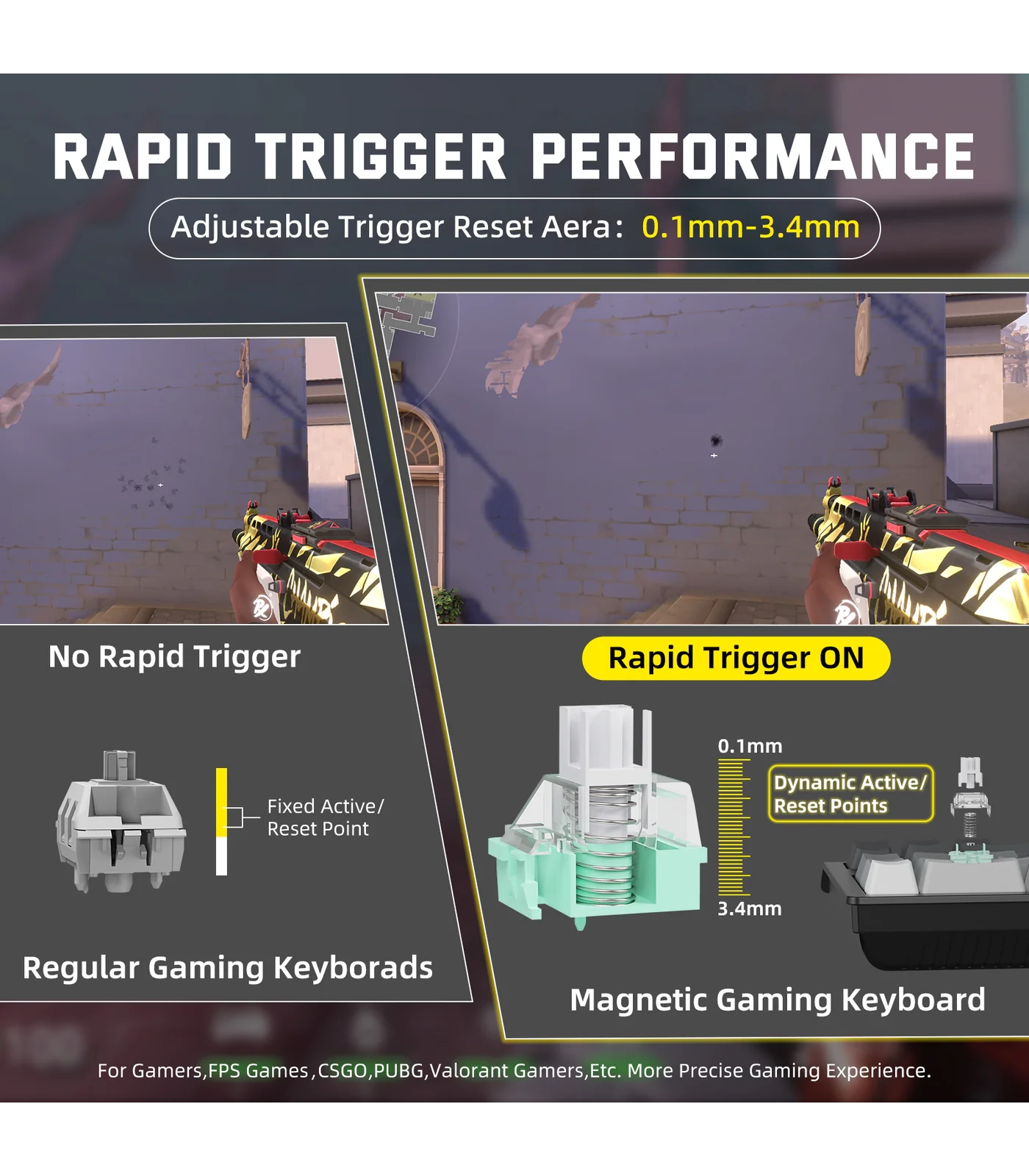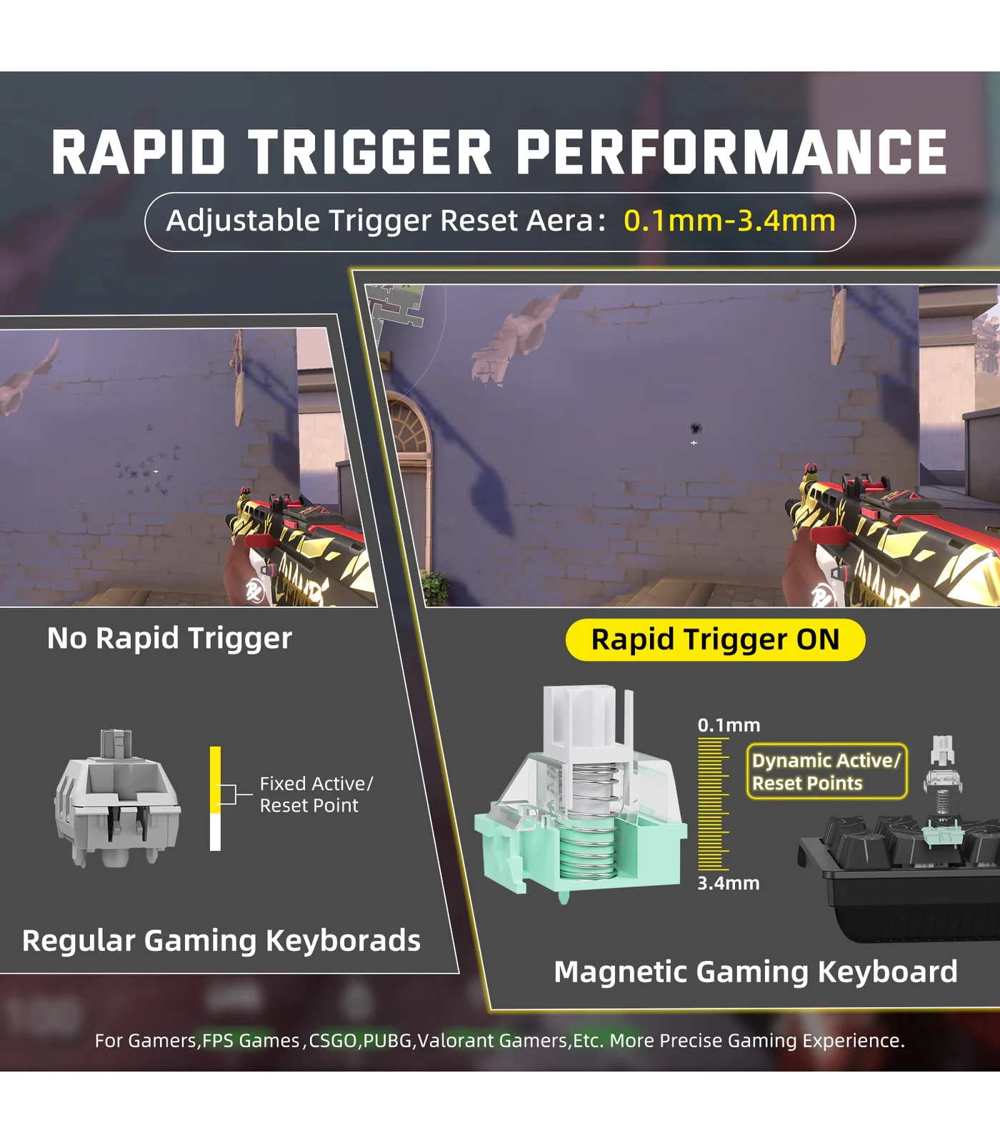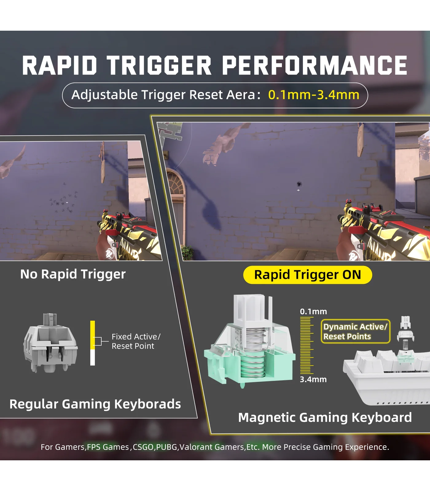تتميز اللوحة بدقة تفعيل تصل إلى 0.01 مم بدون منطقة ميتة، مما يسمح بإعادة تعيين المفتاح فور رفع الإصبع، ويوفر تحكمًا دقيقًا وسرعة استجابة عالية في ألعاب FPS وMOBA وغيرها من الألعاب التي تتطلب أداءً فوريًا.