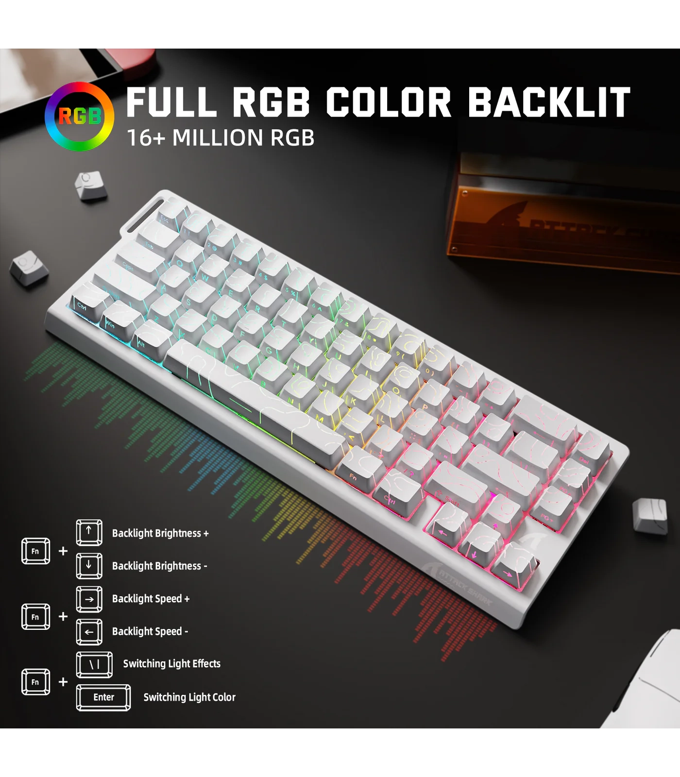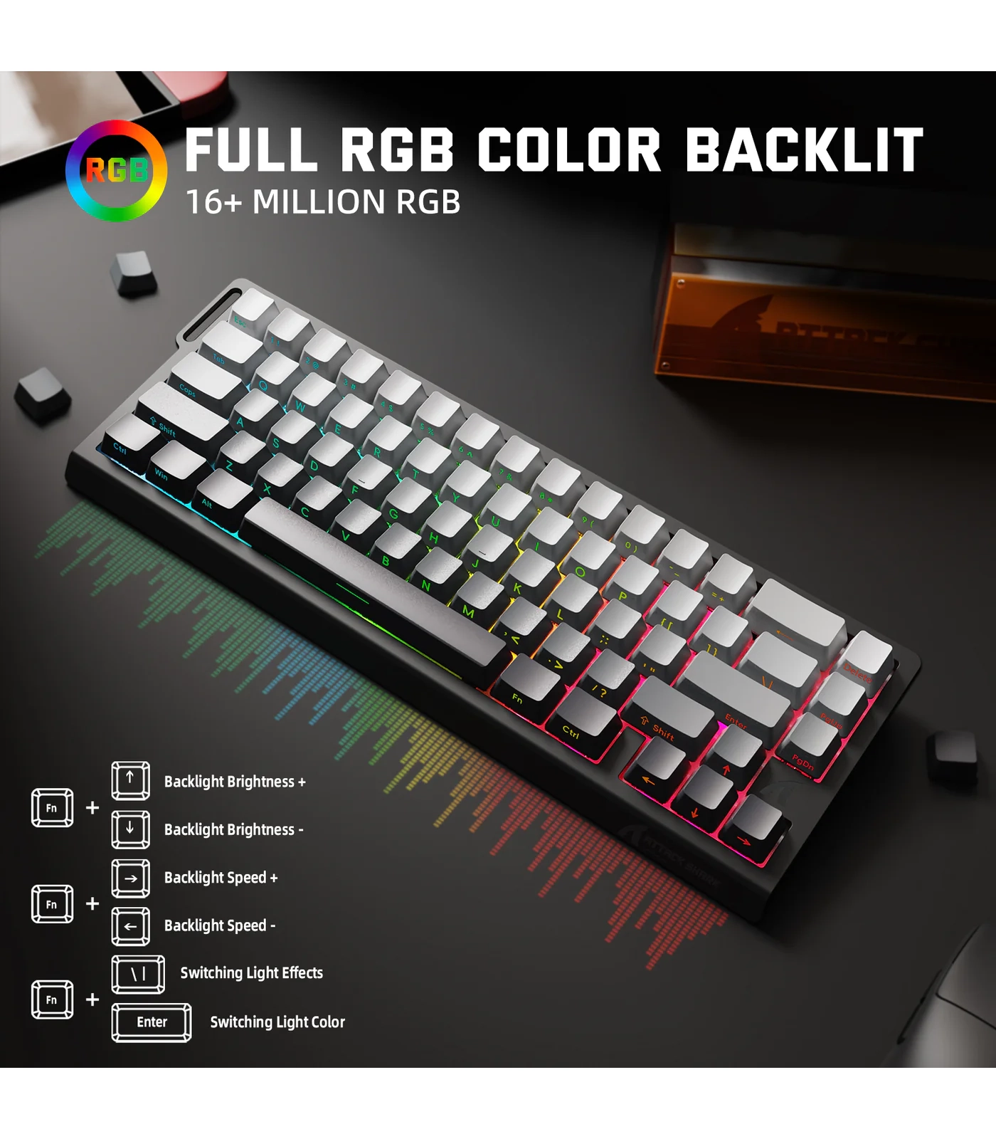 تأتي اللوحة بكيبكابس PBT مزدوجة الحقن مع إضاءة RGB جنوبية الاتجاه بـ 16 مليون لون، وتدعم أكثر من 20 وضع إضاءة قابل للتخصيص عبر تعريف ويب يعمل مباشرة من المتصفح دون الحاجة لتثبيت برامج، ومتوافق مع أنظمة Windows وMac.