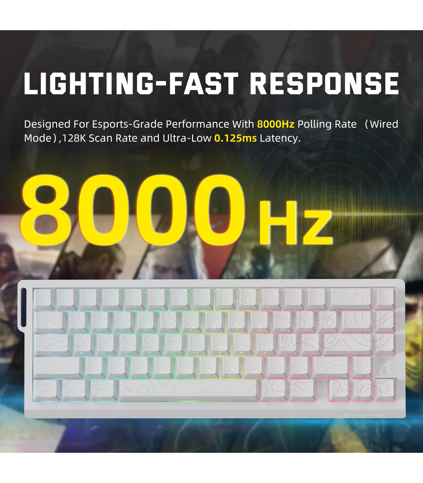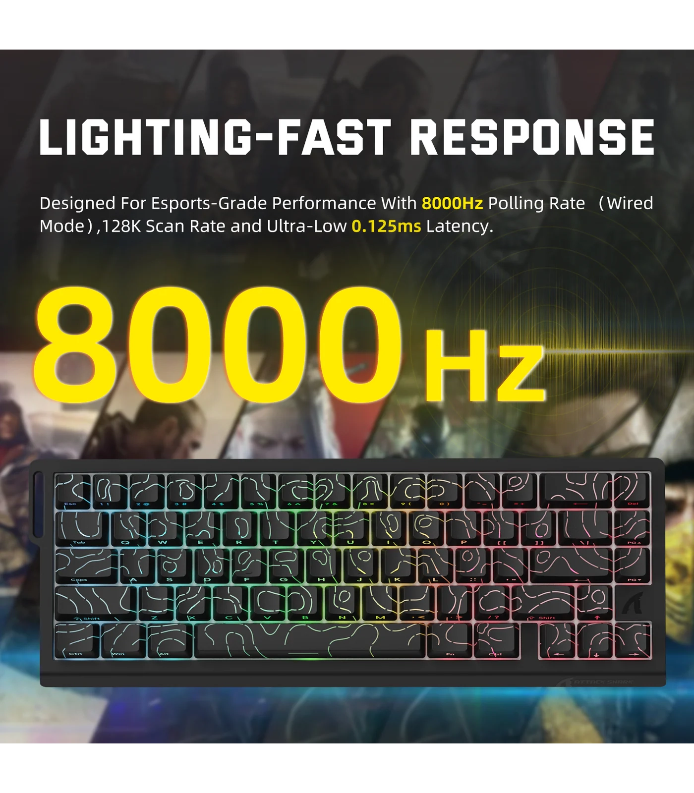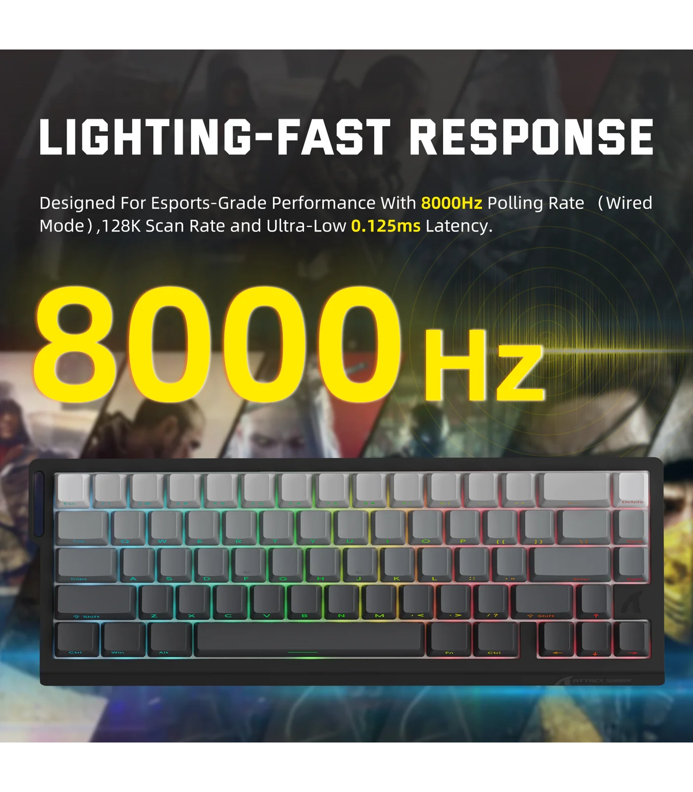 توفر ATTACK SHARK X68PRO HE معدل استطلاع يصل إلى 8000Hz في وضع التوصيل السلكي و1000Hz في الوضع اللاسلكي، مع زمن استجابة منخفض يبلغ 0.125ms ومعدل مسح 128KHz، ما يمنح أداءً أسرع بعدة مرات مقارنة بلوحات المفاتيح التقليدية.